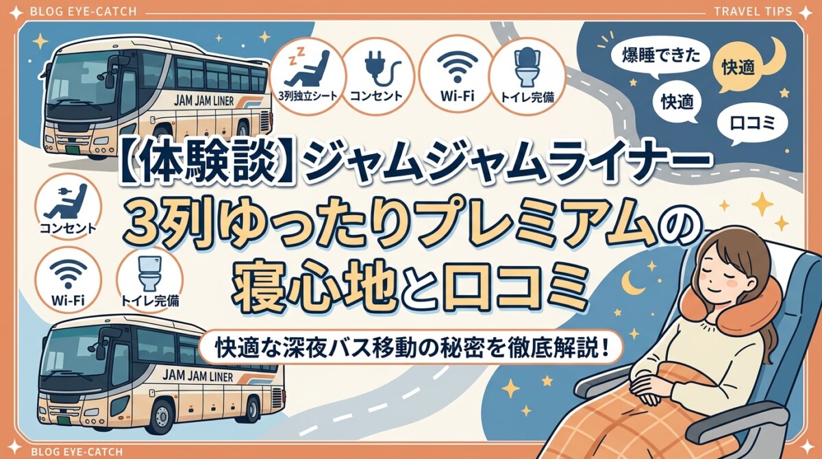 結論からお伝えすると、ジャムジャムライナーの3列「ゆったりプレミアム」なら、そんな夜行バス特有の疲れやストレスを大きく軽減できます。